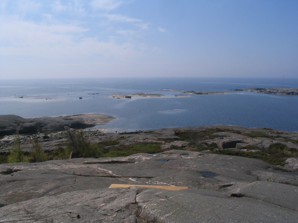 The view from the south shore, with a bench nestled into the rock terrace to look out on it, and with the fog mostly burnt away.