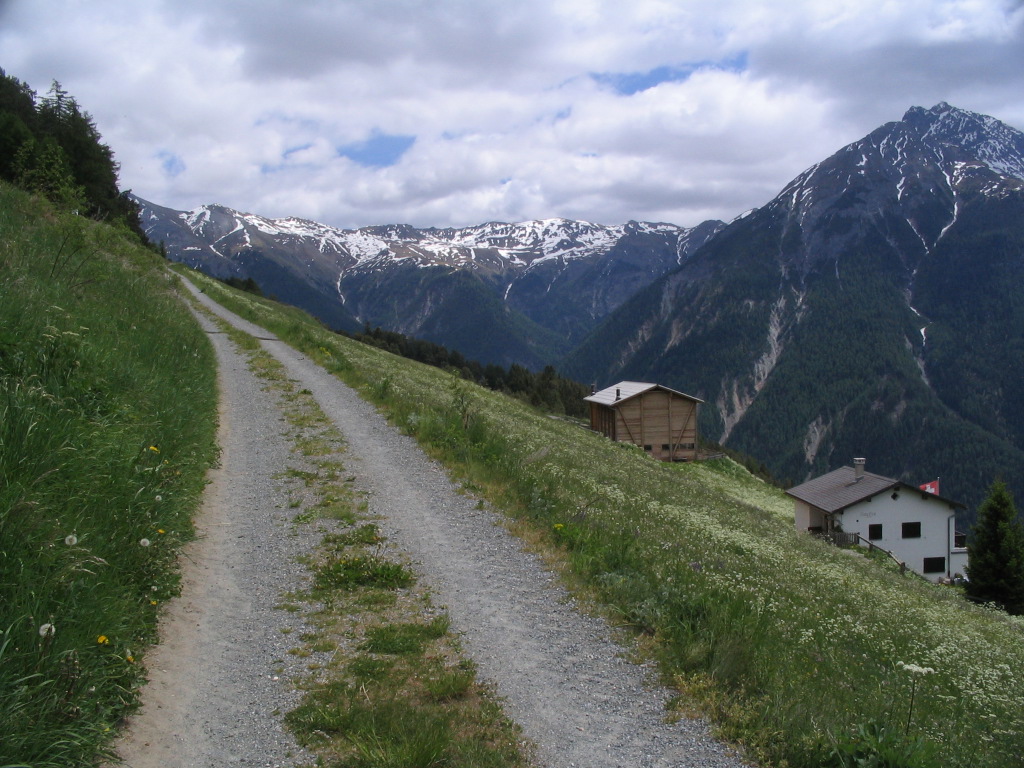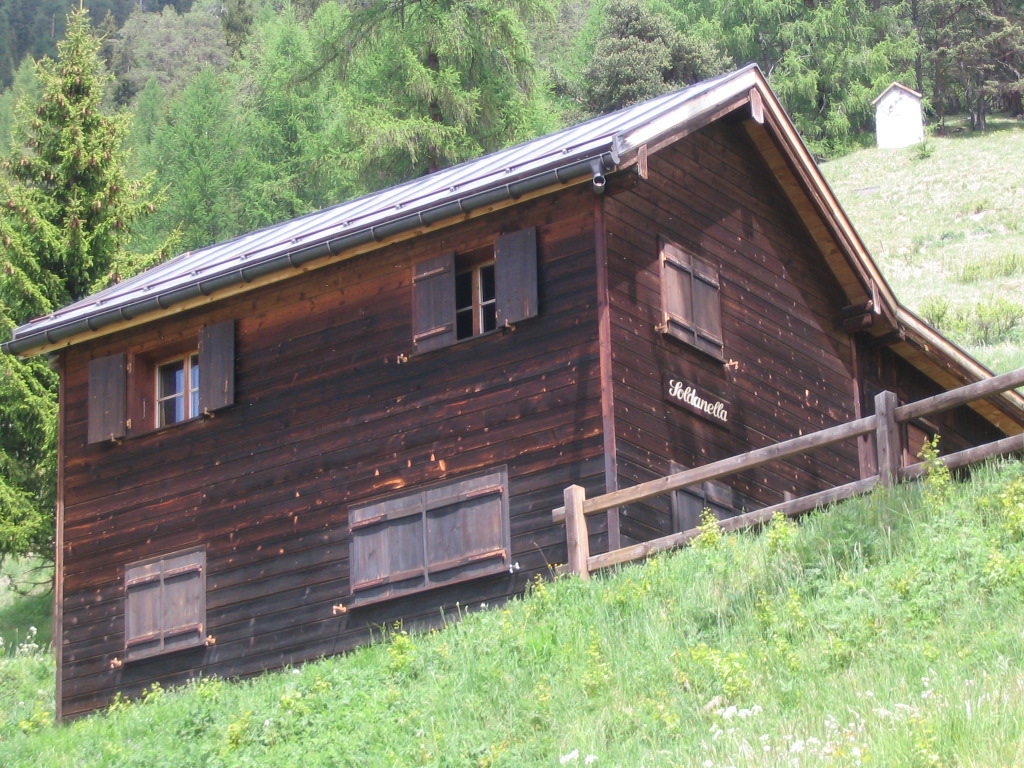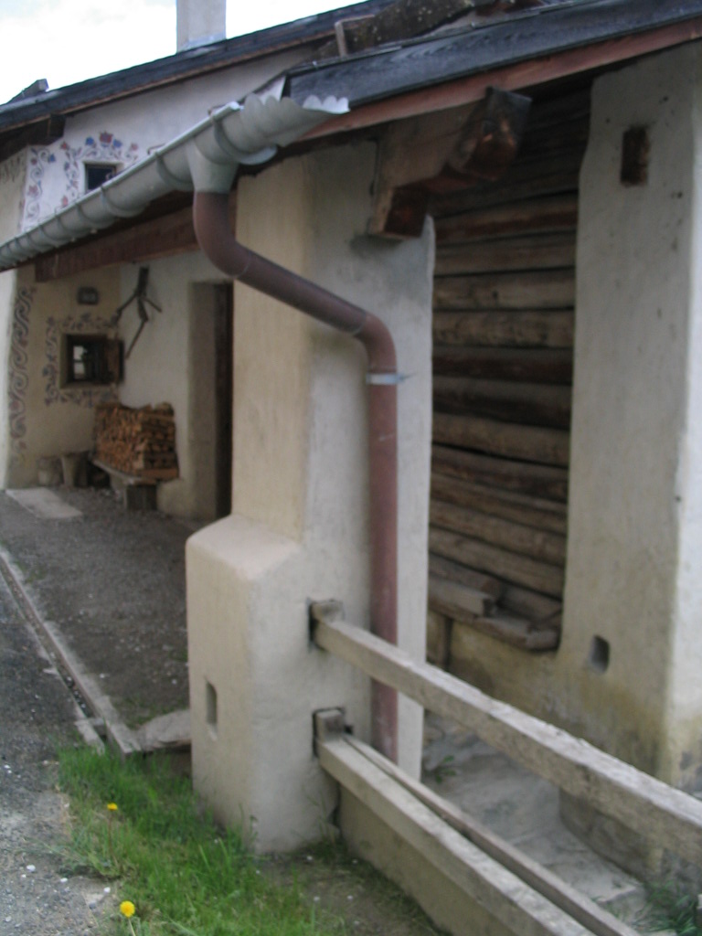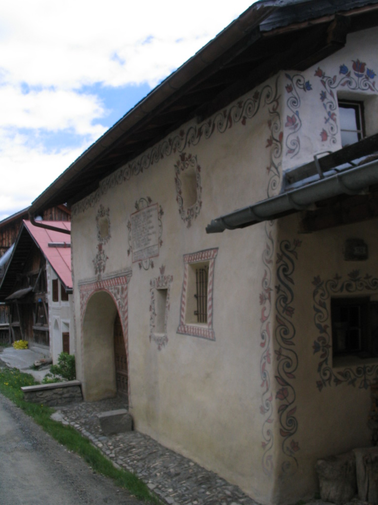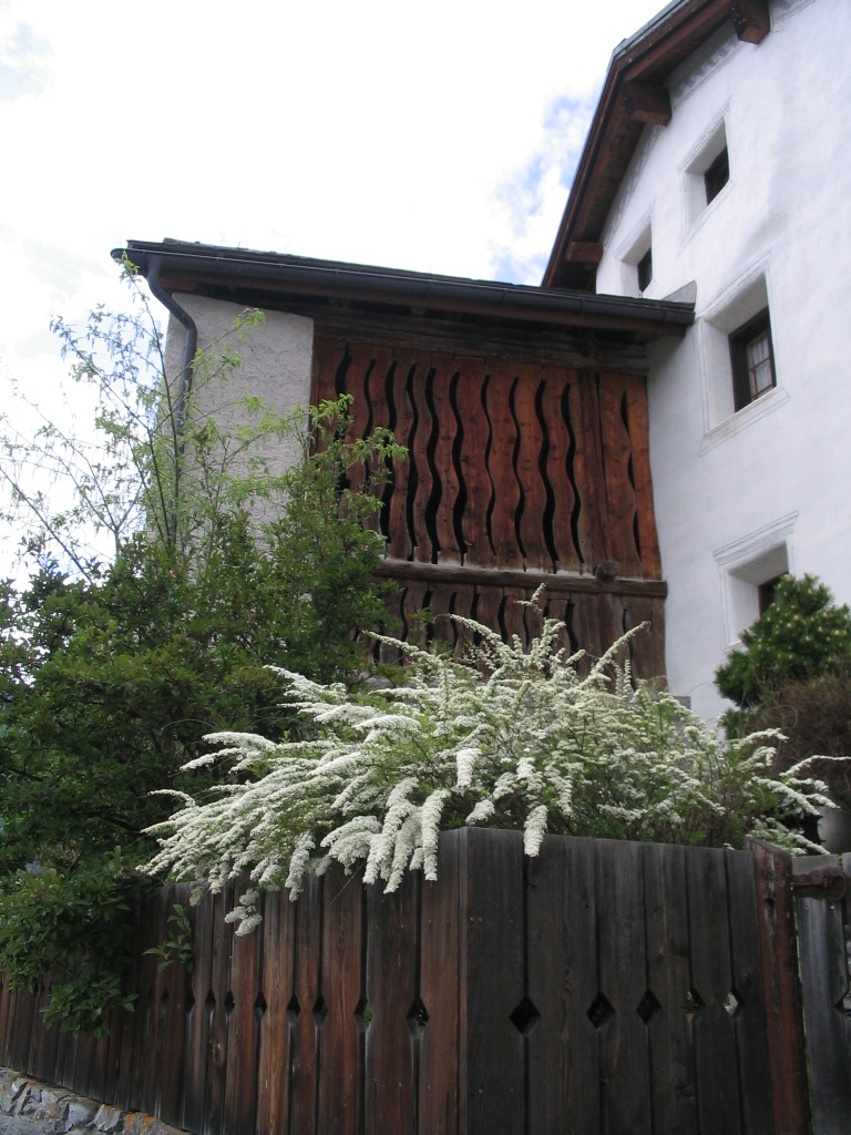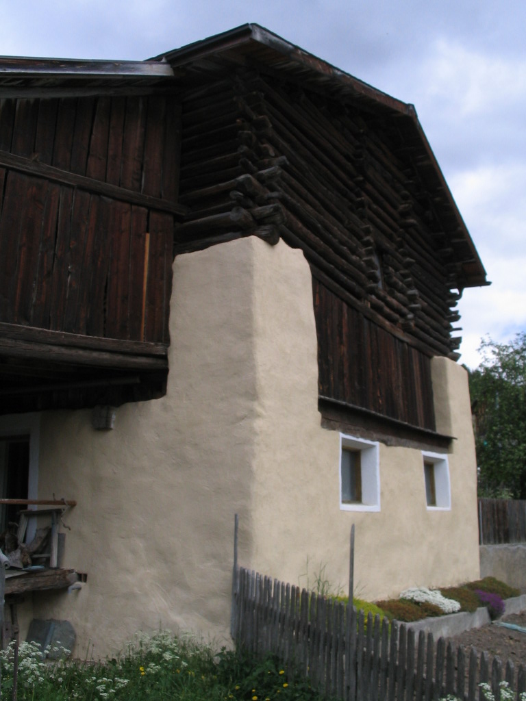 An unusual construction: not just Blockbau but round-log Blockbau, but just at the top floor, as if a house from another alpine region had been plunked on top of a disenroofed Engadin house.