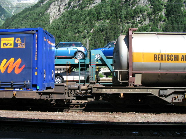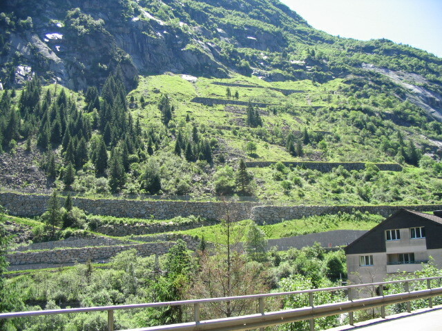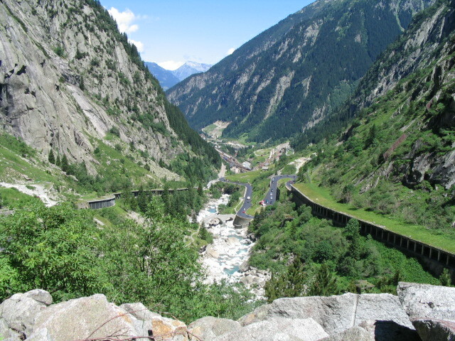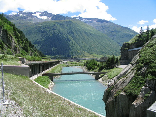 Once we emerged thence, this view opened up: the canalized upper Reuss and the Andermatt plateau disappearing around the slopes beyond. The plateau, which we proceeded to in order to reach the railway station to take the funicular back down to Göschenen, really feels like the rooftop of Europe, since it connects to so many mountain passes.