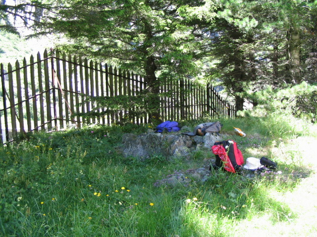 The lunch spot, with the dropoff down to the road beyond the fence.
