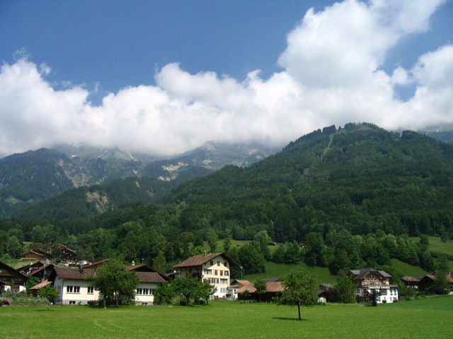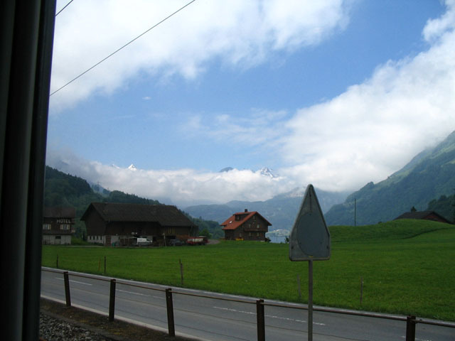 The very first picture of the whole trip. This was on the rail route from Luzern up over the Brünig Pass into the Berner Oberland, and it was the first time on the journey that I glimpsed the High Alps, which you can see beyond the clouds in the distance. I think it's the Lungerersee (the Lake of Lungern) that you can just see beyond the house.