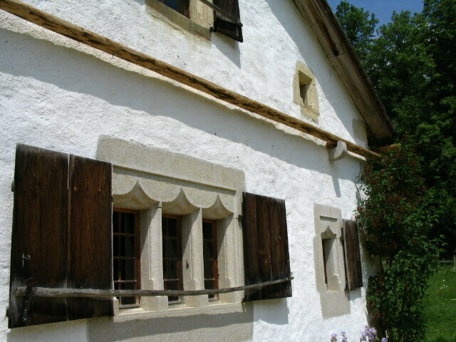 Farmhouse from La Chaux-de-Fonds, Neuchâtel, 1617. I like the semi-random arrangement of windows in the wall. Note the wooden gutter running from right to left; see also below.