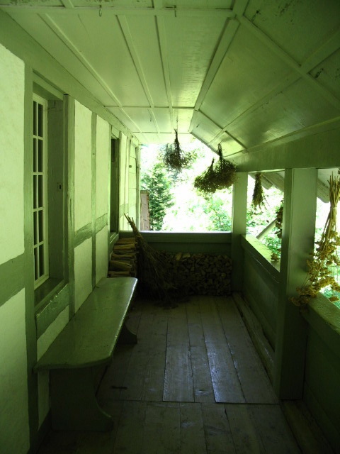 An upstairs back balcony of the same house. The all-consuming green color is mostly an effect of the vibrant vegetation reflecting sunlight inward, although the trim is a little bit green to start with.