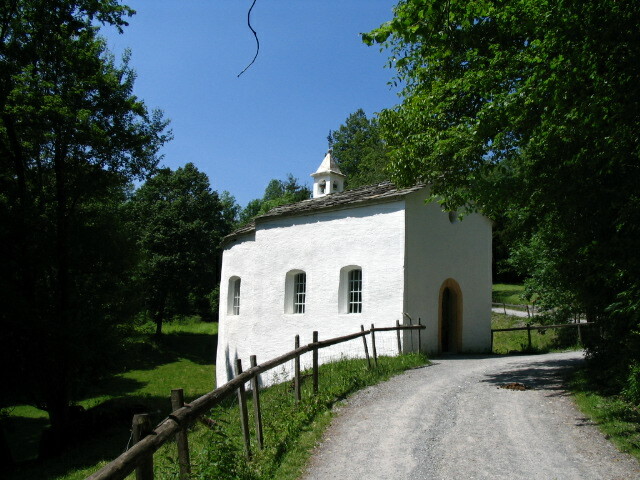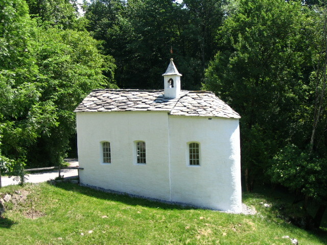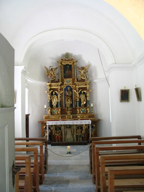 The interior, including the baroque altar, of the chapel. The wide contrast in complexity between the altar and rest of the building's elements can also be seen in chapels in the Lötschental.