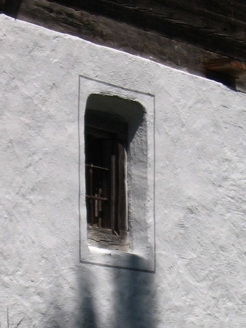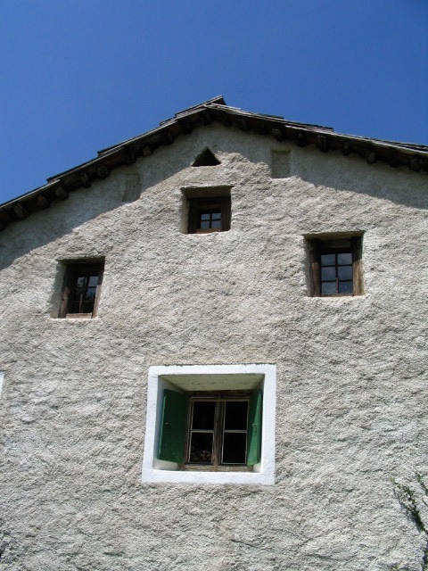 The façade of the farmhouse. On reappraisal after having seen the Lower Engadin, this has clear Graubünden characteristics, such as the masonry construction and the contrasting plaster window frame.