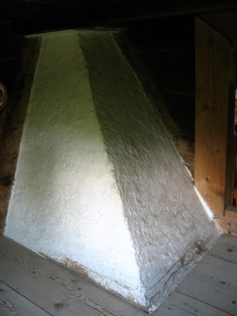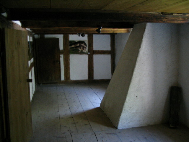 A half-timbered room in the house, with a chimneymid.