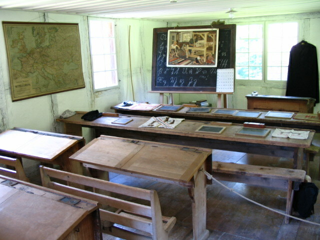 A schoolroom, oddly enough, in the same building. Note the national boundaries on the old map — it must be from between the World Wars.