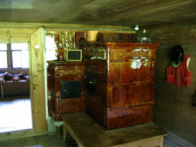 A magnificent Kachelofen inside, with a traditional Appenzeller vest hanging to the right, so you know where you are.