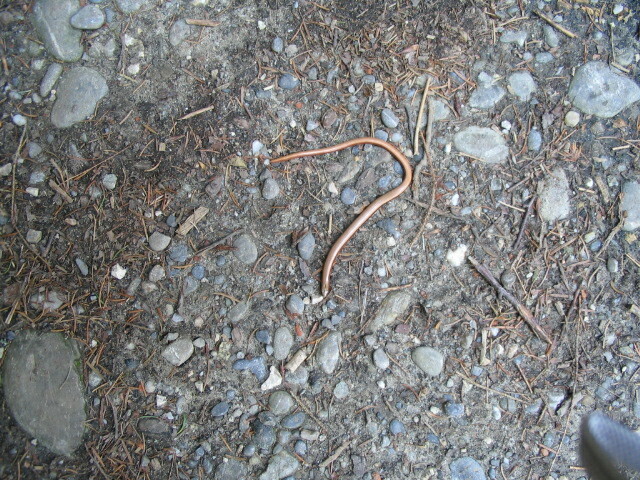 A small coppery snake. I moved it off the trail, holding it carefully with sticks — a challenge.