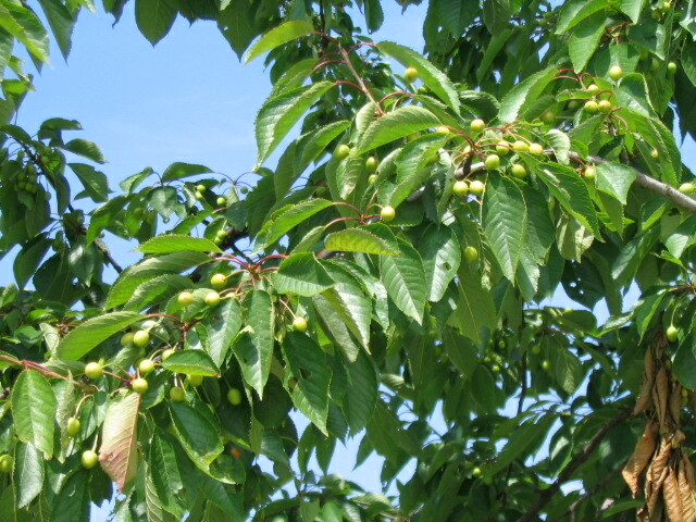 Fruits or nuts on a vibrant tree (besides a few withered branches). Not sure what sort of tree.