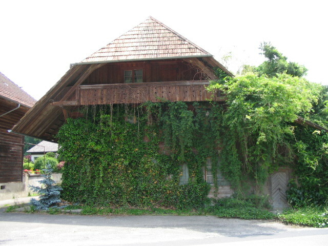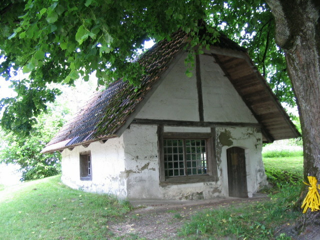 A pretty, whitewashed outbuilding. I'm curious what it's used for, because the roof is unusually steep for here, and the front window is unusual as well.