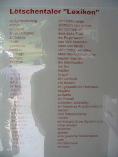 In the bus shelter: some useful local Lötschentaler vocabulary. The Löschental dialect and its near neighbors are, as Swiss German goes, about as different from standard German as you can get.