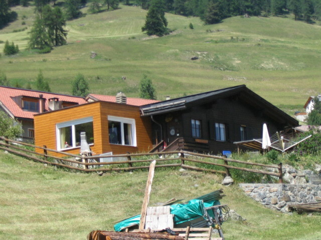 I clambered up the mountainside up to Ftan, partly on the road and partly bushwhacking. This house with a funny modern addition was in the first area of the town that I saw.