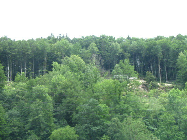 A view up into Ballenberg (Ticino section) from the train. The train travels up the flattish Aare valley, which Hofstetten and Ballenberg are cliffily separated from.