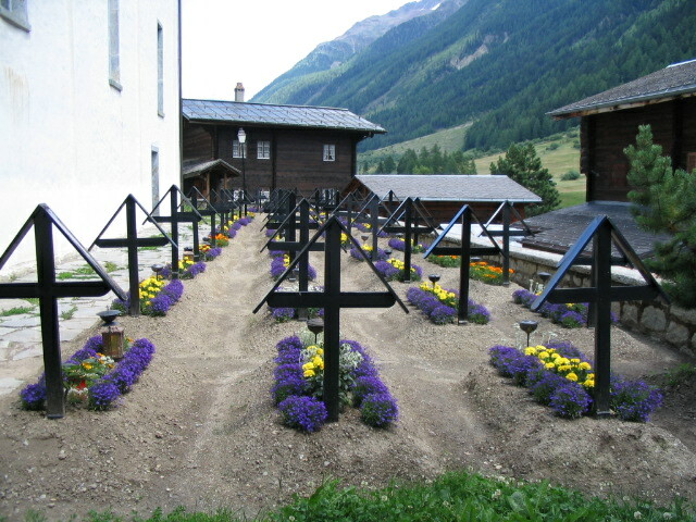 The cemetery (Friedhof, literally "courtyard of peace") next to the church. Nice flower colors.