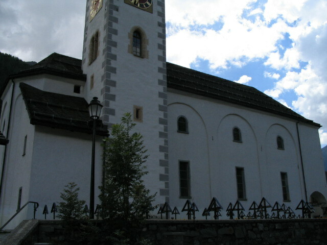 The side of the church. This is the principal church of the whole valley, and it is a lovely building, with fine detailing (e.g. the quoins of the clock tower) and proportions (e.g. the round-arched bays).