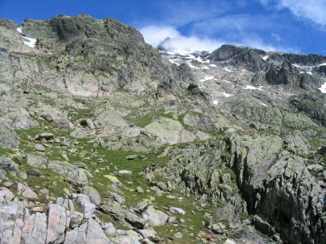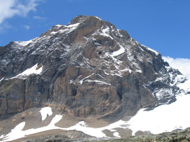 The Ferdenrothorn displays some intense geological folding. Look closely and check out the ruddy strata writhing from the peak all the way down to the scree.