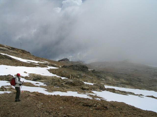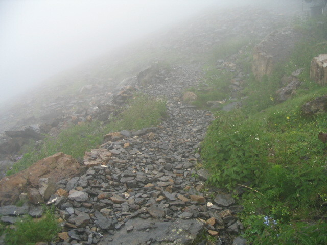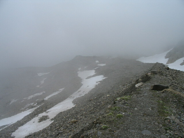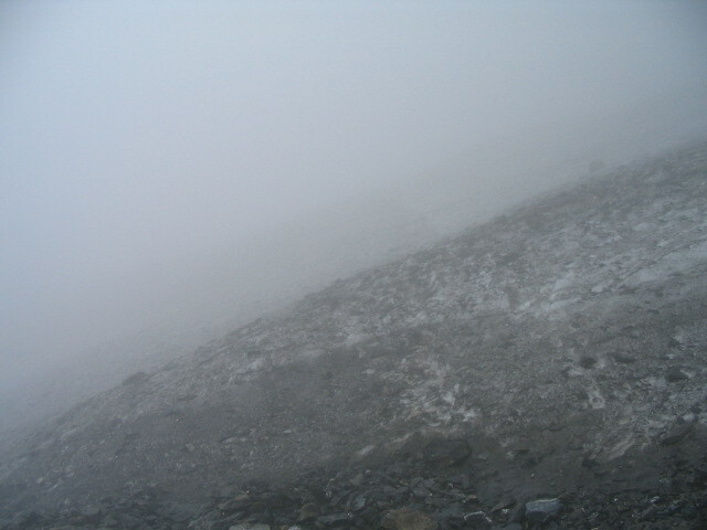 Man, I sure am glad that the trail across this GLACIER (you'll see it more clearly soon) is revealed only by marker posts at a significant distance from one another, rather than there being any continuous trail! I'm also glad visibility is falling sharply!