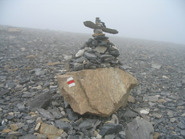 Another such marker. The cairn style is neat, but I would be worried about the directional stone toppling over with not too much difficulty. Maybe the stones are actually attached to one another.