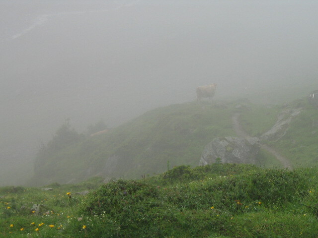 Incredibly, we did not get lost (for long) on, or slide down, the glacier, even where the trail was a narrow path across a steep, corn-snowy part of it. The jingle of cowbells, and then the sight of the cows, was a reassuring sign that we were returning to civilization, as they had been near the end of my National Park adventure.