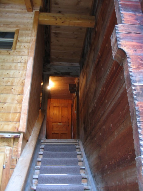 There are both individual rooms and this hostel room; I stayed in here, and had the whole thing to myself. I slept incredibly well after starting to digest the hundred delicious pounds of food I had eaten at dinner. Unfortunately I left my red wool hat there (:( A curious reflection effect on the wood happened from the camera flash.