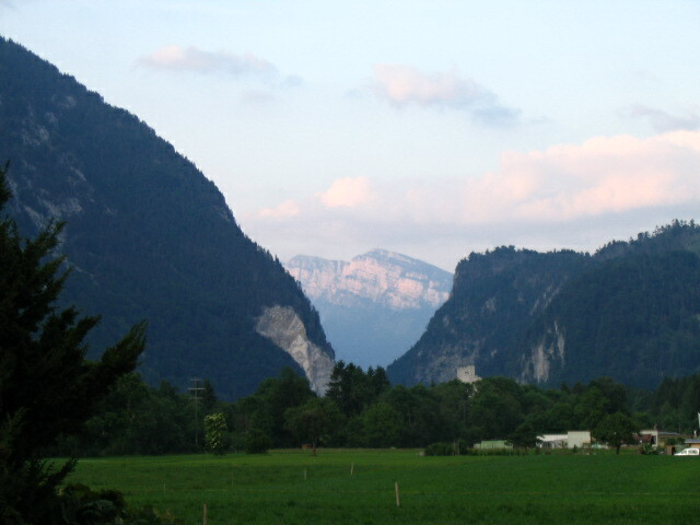 On the Erlenbach walk: a look down the Simmental toward Spiez. It looks like there's a castle or fortress in the middleground, but it's actually a curious towering industrial building.