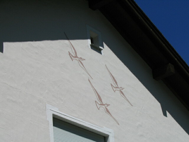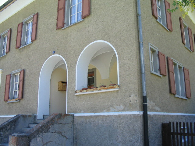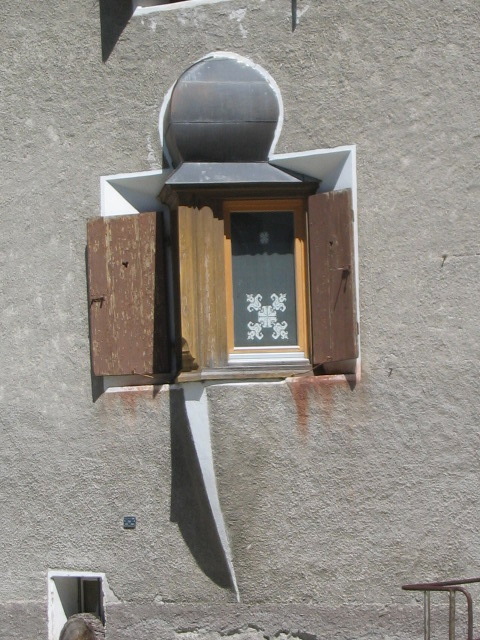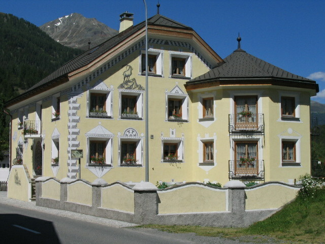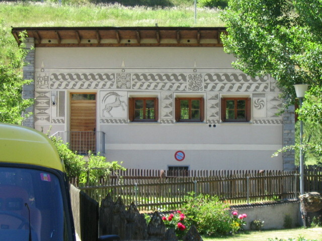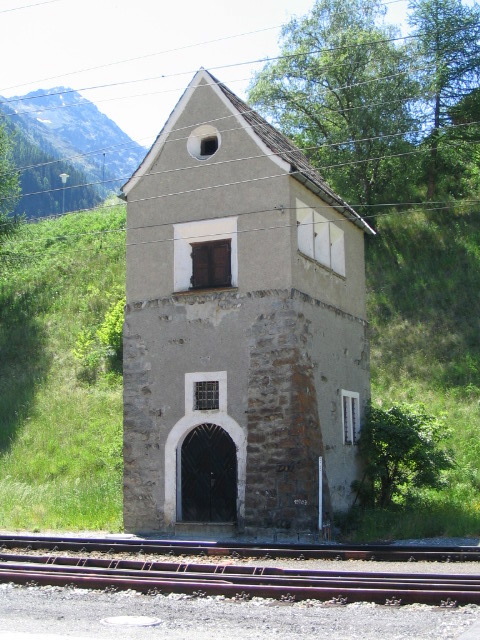 Susch Signal Station, in the very distinctive Engadin railroad-building style — wall and window treatments similar to that of other Engadin buildings, but with steeper roof.