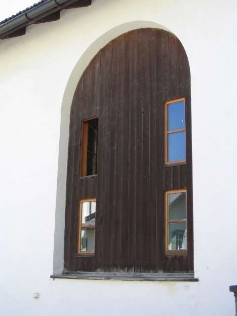 Formerly a single large opening, adapted into a wall with smaller windows.