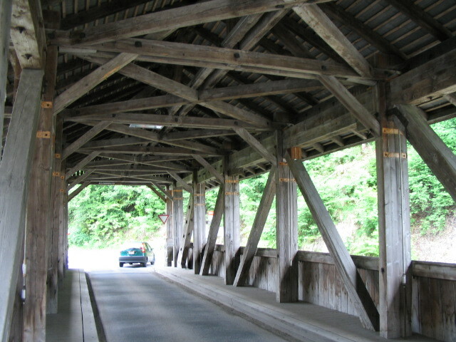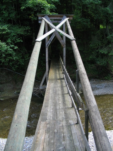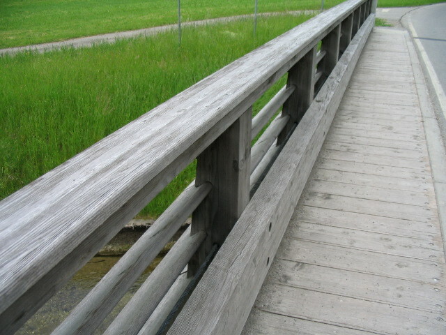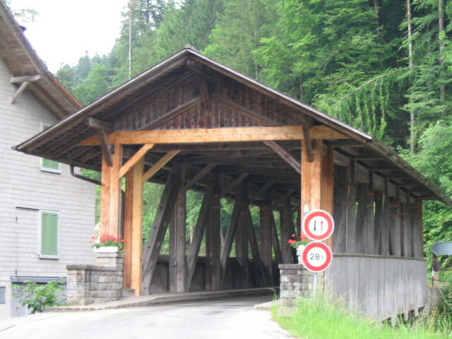 A bridge over the stream flowing by Trub that leads to trails up the ridge. Note the railing on just one side.