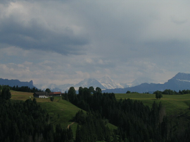 View atop the ridge: the Eiger, Mönch, and Jungfrau, the crowning mountains of the Berner Oberland. I was quite surprised to see them because the Emmental is miles and miles away and there's no hint of them in the valleys. But of course they are very high mountains, so it makes some sense that they'd be visible from the ridge.