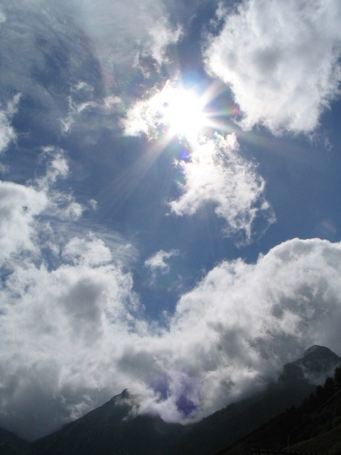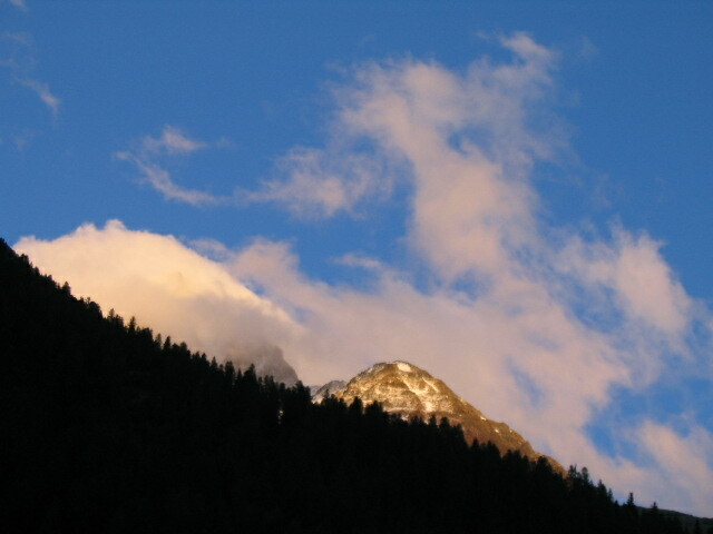 I think this is the Bietschhorn, partially covered by orographic clouds in the last sunlight on the peaks, while it was already deep twilight in the valley.