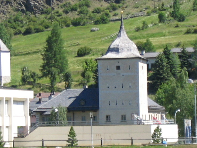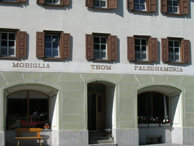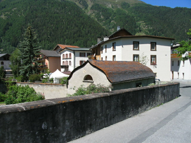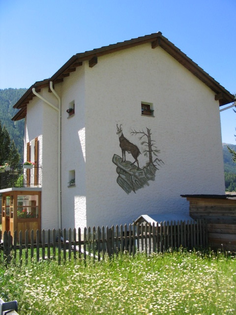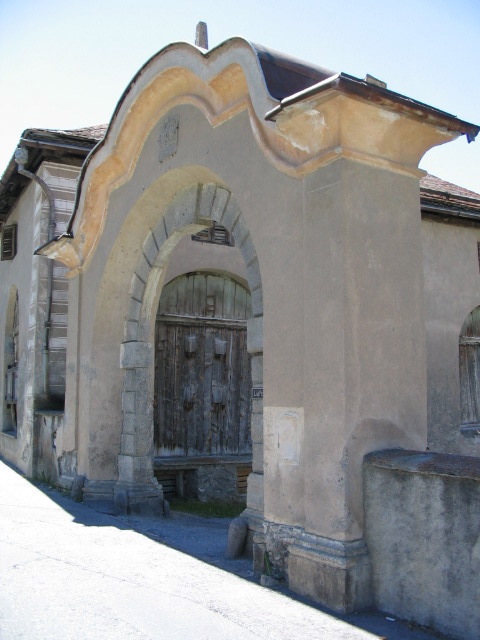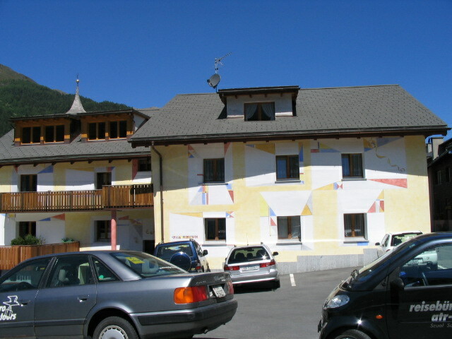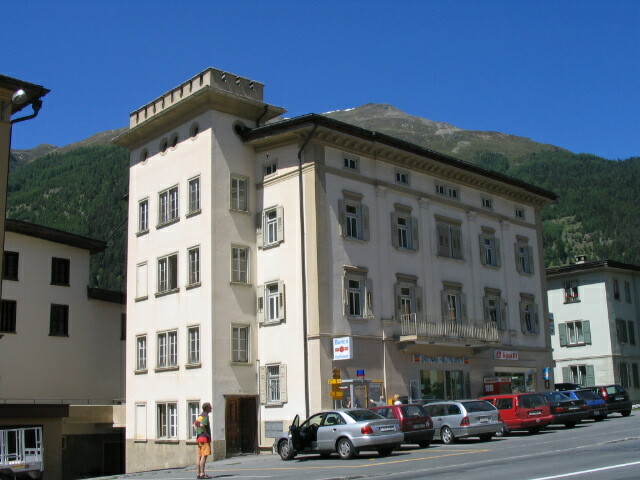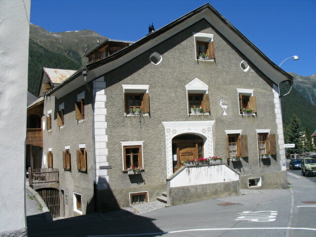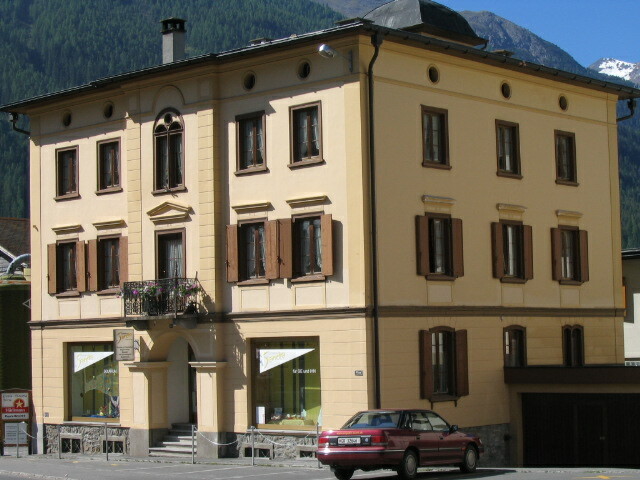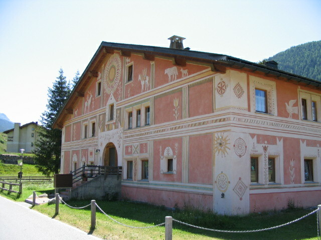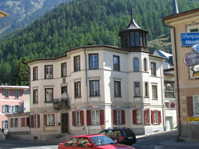 A lot of Engadin buildings have the kind of corner recess that you see here, and I'm not entirely sure of their purpose. It could be like the roof & wall cutoffs that are so numerous in Canton Bern, or maybe it has something to do with taxation according to size of building footprint, which is the reason for cantilevered over-floors on olde English buildings. But you would think the rebate wouldn't be that great for a little corner like this.