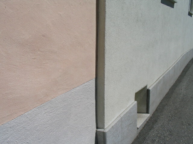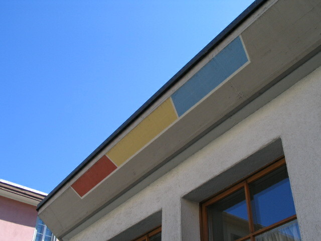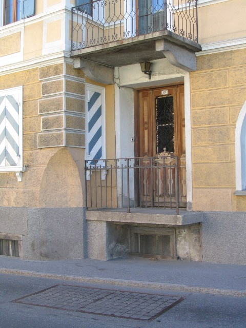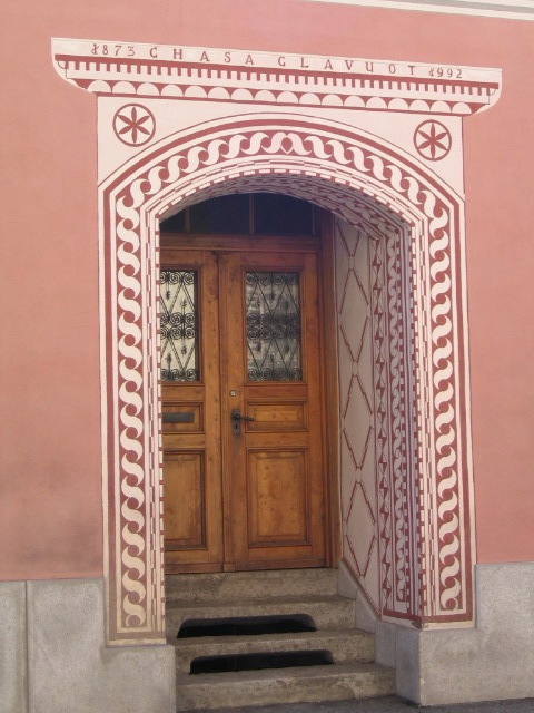 Very wide door with modern sgraffito around. This and the next few houses are in a newer part of town.