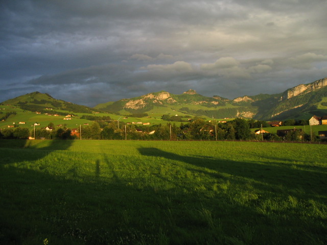 Appenzell, in the northeast of Switzerland, is a unique canton. In actuality, it comprises two half-cantons, Appenzell Innerrhoden and Appenzell Ausserrhoden, the former almost entirely agricultural and Catholic, the latter more industrial and Protestant. Oddly, Appenzell is completely surrounded by the canton of St. Gallen. Appenzell's landscape is unusual, consisting of mostly meadows with some wooded areas, interrupted (or underlain) by rock formations that appear to have swung up out of the ground: