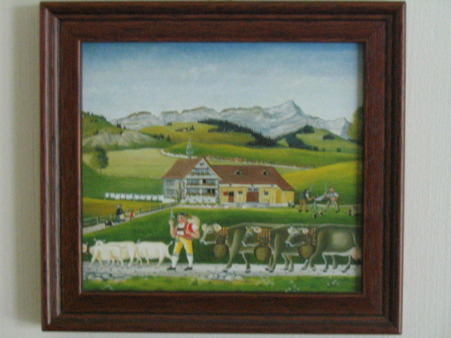 Also, its particularly independent people have held on to many traditional cultural elements, a few examples being ornate ceremonial costumes, culinary specialties, and folk landscape paintings. Interestingly, because of this loyalty to tradition (the negatives of it as well as the positives — in Innerrhoden, women were granted suffrage on the cantonal level only in 1990), Appenzellers are often prejudicially regarded by other Swiss people as country bumpkins. But the built environment goes a good length in belying this perception. Appenzell's architecture, like that of several other Swiss regions, is unique. Once you've been around it for just a bit, it is instantly recognizable, both in real life and in the traditional landscape paintings, which, as Marcia Lieberman writes in Walking Switzerland the Swiss Way, are "almost indistinguishable" from the physical landscape itself (p. 255) (for an illustration of this, compare 38 with 39 below).
