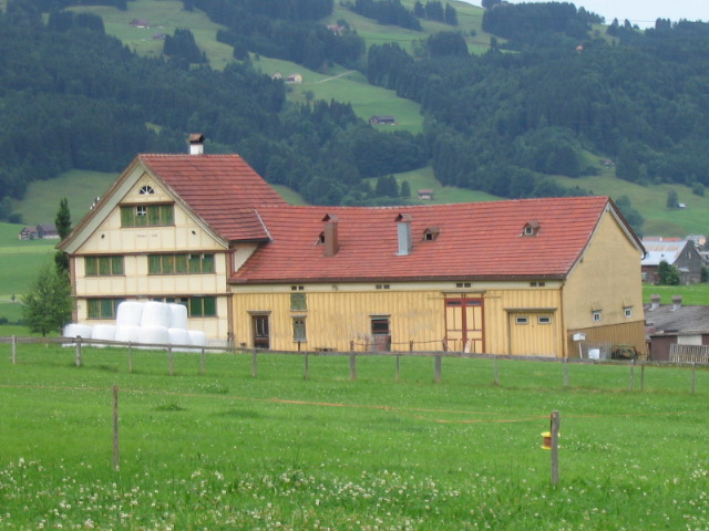 Farmhouses, the predominant building type since Appenzell is primarily agricultural, are characterized by several unusual features: the gable of the house portion faces front while the barn's roofline runs perpendicular to the house's; the house has whole rows of adjacent windows in front that often take up most of the house's width; the house's façade is paneled; the side wall of the house is often extended past the front wall a little ways, for wind protection; and often the building is painted in multiple bright colors. Picture 39 above shows a farmhouse with most of these elements. The Appenzeller style is not limited to older farmhouses; village houses, as well as modern buildings, almost always reflect the farmhouse style in some way or another: