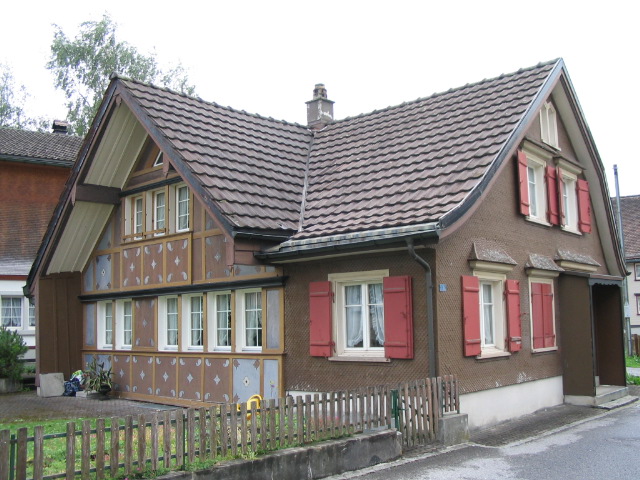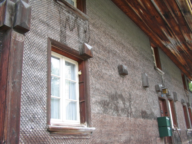 The siding of houses is, if not smooth wood paneling, sometimes small semicircular shingles, which show up in other places as well, such as the Emmental and the Bernese Oberland: