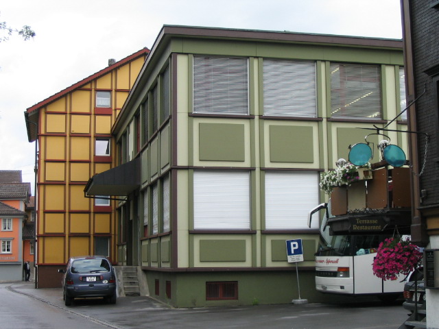 41. Modern industrial building in downtown Appenzell still shows the influence of tradition in its paneled façade and mixture of colors.