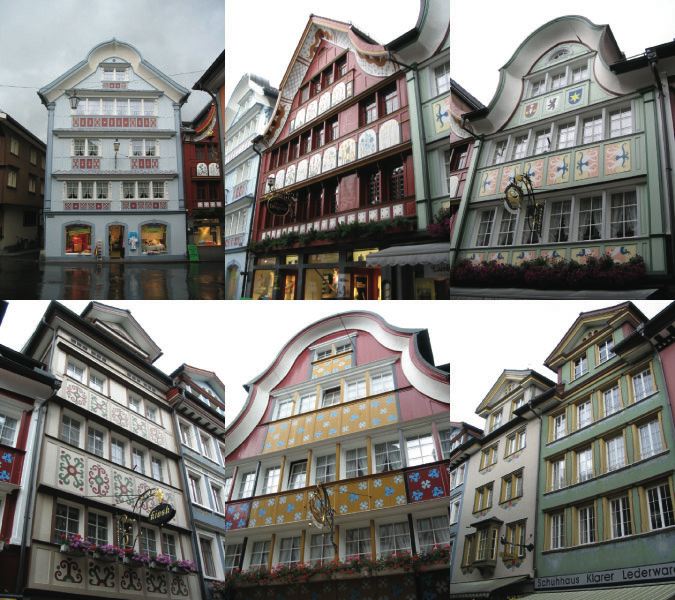 42. Appenzell Main Street medley. Note all the colors, designs on the panels, and roof forms, some with classical or Flemish-like influences.