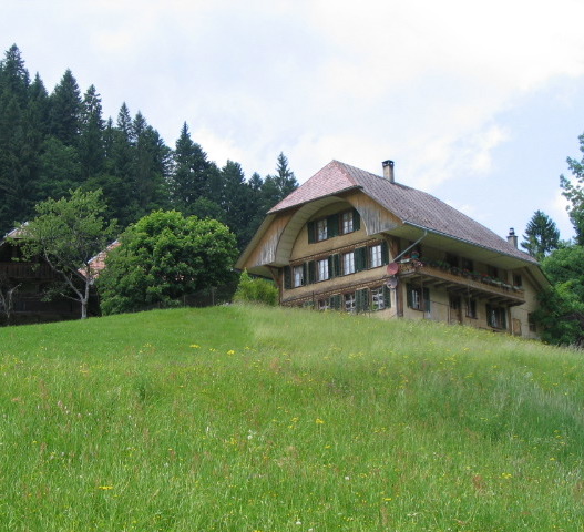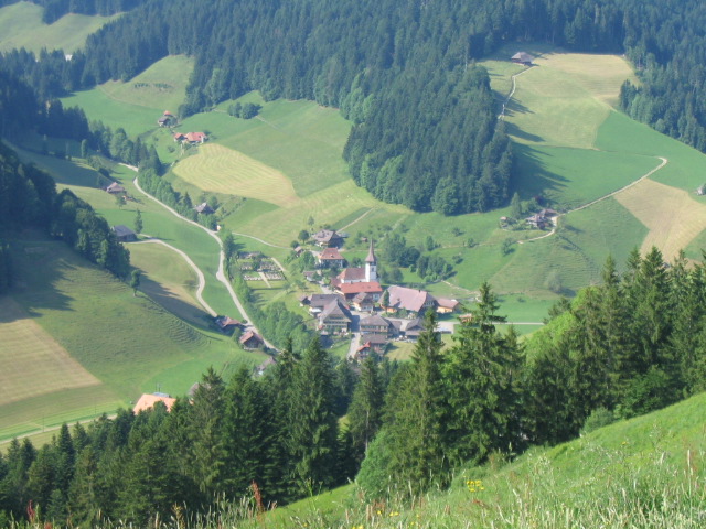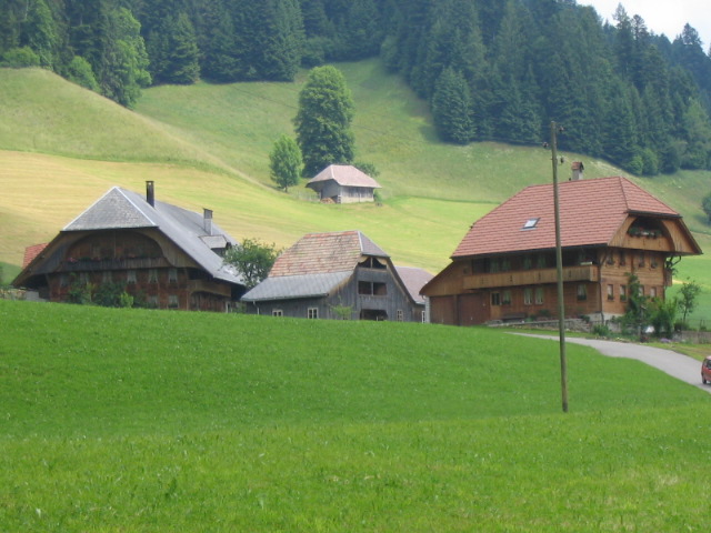 The Emmental (Emme Valley) is a region of rolling hills in Canton Bern, further north and at lower elevation than the Diemtigtal or the Brienz area. Its topography is softer than that of the previous areas and is more easily suited to agriculture. For this reason the general pattern of settlement is more oriented towards spread-out farms than concentrated villages. For instance, the town I stayed in, Trub, has a very small main village —