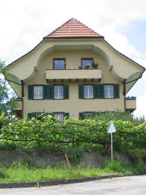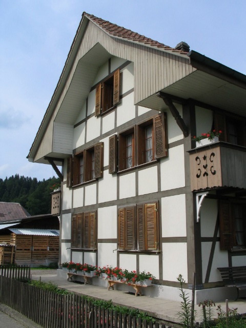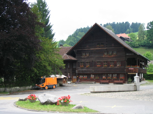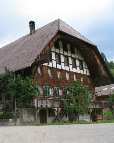 — but with a large total land area, it is actually one of the larger municipalities in the area. In architectural terms, the Emmental is a gem. It is saturated with examples of the unique and instantly recognizable Lower Bernese building style, also found with lesser frequency in the western Oberland, as we saw in the Diemtigtal. Emmentaler buildings can be Blockbau but are more often post-and-beam. An almost universal feature of the style is a hipped roof; another quite common element is the Ründi, a kind of semicircular soffit under the front gable (see below for an example of both).