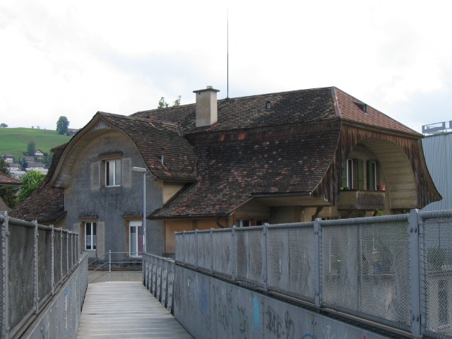 28. This ramp (its roof at the top of the picture) is so high above ground that it makes room for two walk-under levels. Emmenmatt, Emmental.