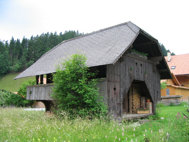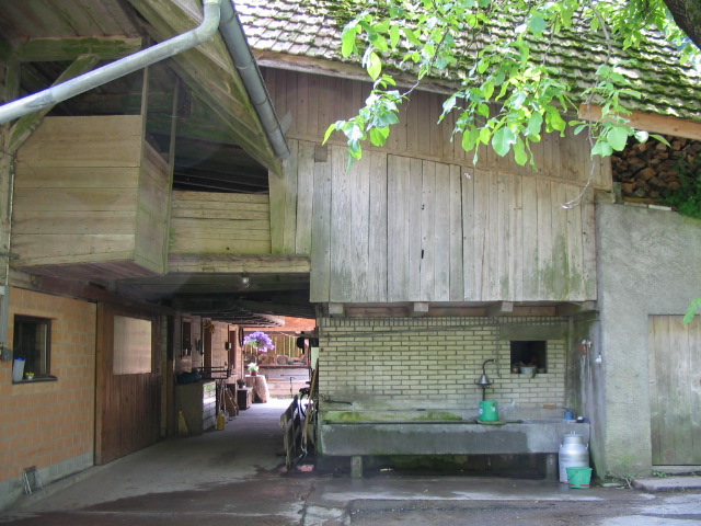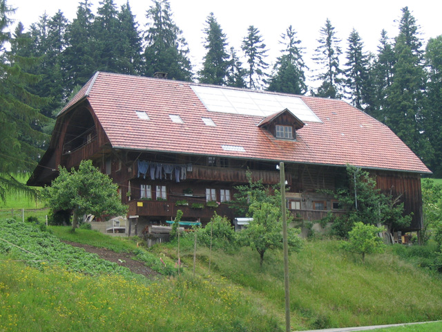 The construction of Emmentaler buildings is usually post-and-beam and not Blockbau, except for Speicher, which often are Blockbau. Intuitively, this makes sense: Blockbau uses a lot of wood for a given wall area, and Emmentaler Bauernhöfe, often being of massive proportions, have very large wall areas. Post-and-beam is a more conserving (and probably cheaper) construction method. Speicher, meanwhile, are small enough to make Blockbau, a conceptually simpler building form, easily viable. A very common feature of the Bauernhof is a ramp, covered by a doubly sloped roof and leading from elevated ground up to the second floor of the barn. Sometimes the ramp forms a bridge over what can be a large open area: