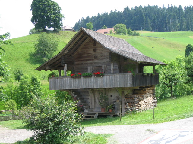 One typically finds a grouping of three main buildings on an Emmentaler farm: the large Bauernhof (farmhouse, 23), which comprises the primary living quarters and barn; the Stöckli (24), a smaller house where, traditionally, the grandparents of the family would live, basically staying out of the way of the daily farm operations but being around when needed; and the Speicher (granary: a few examples in picture 25), where backup supplies of grain and other essentials would be kept in case of a disaster such as fire in the Bauernhof.